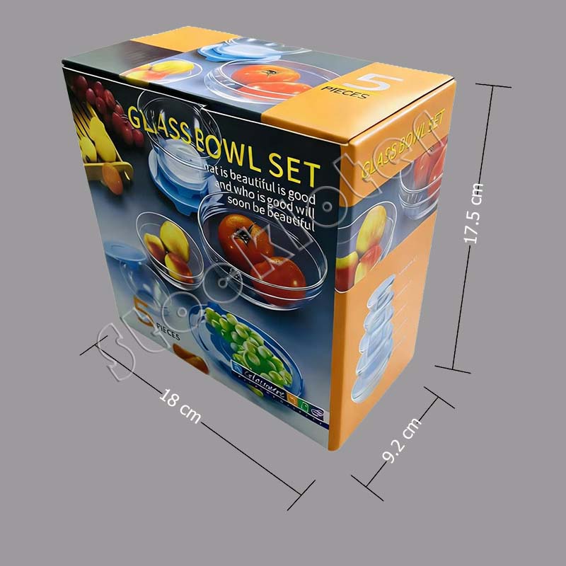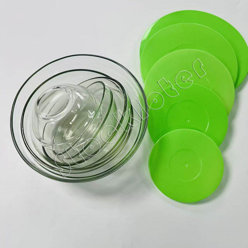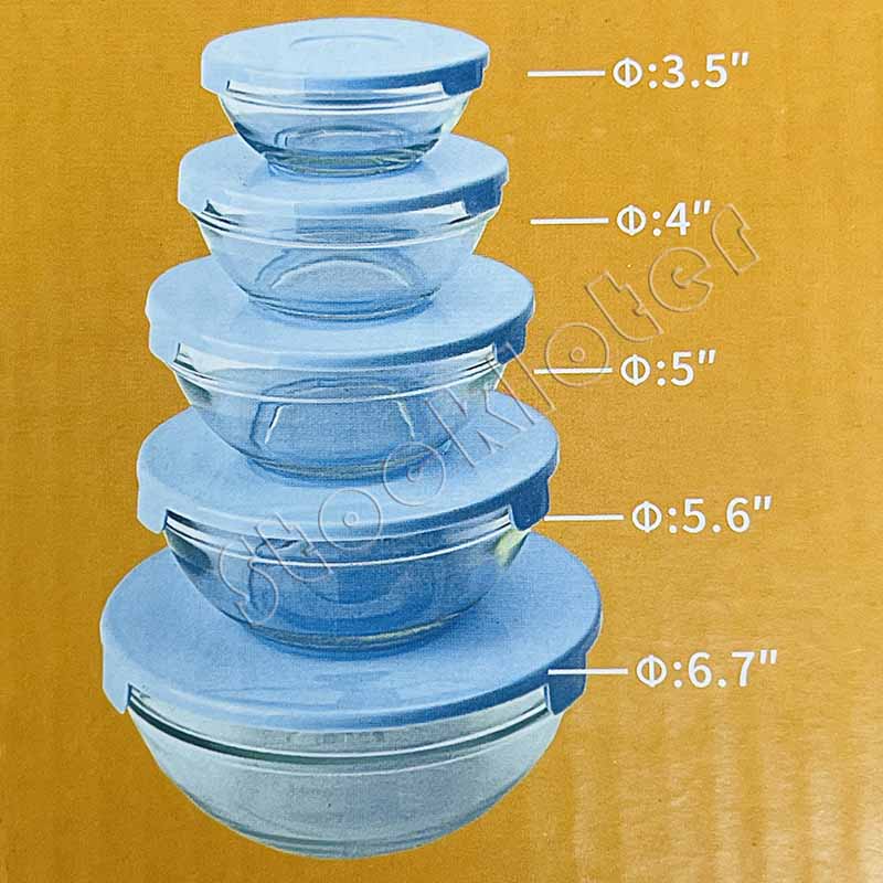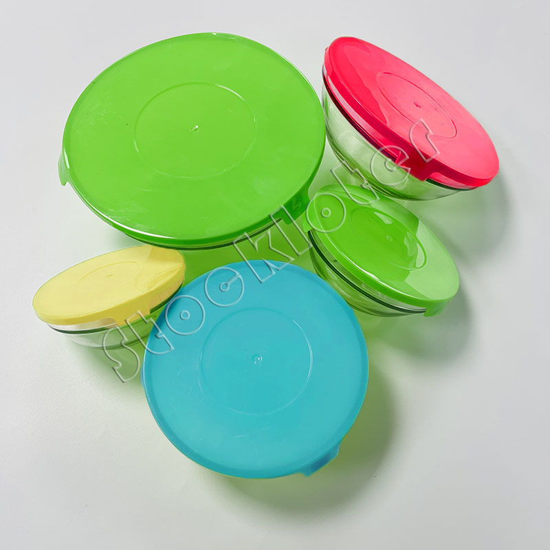 5pc sets borosilicate clear glass bowls tableware with 20,000 pcs in total. Lids with four colors and bowls with five diameter sizes. Contact us for amazing price.