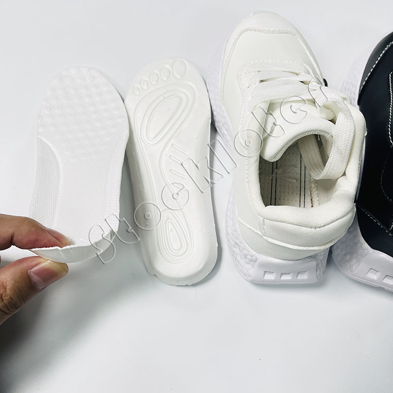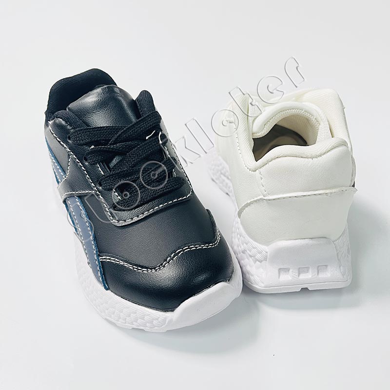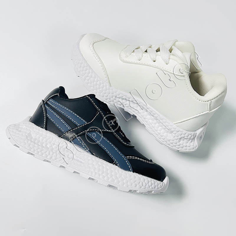 Kids PU sports shoes velcro style running walking sneakers with 7,200 pairs in stock, 2 color patterns and 2 size ranges. Contact us for competitive price.